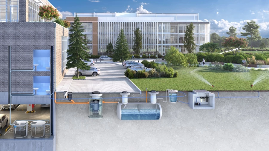 Ilustración 2. Circuito de reciclaje y reutilización de aguas grises y pluviales en edificio y su entorno. Fuente ACO Remosa
