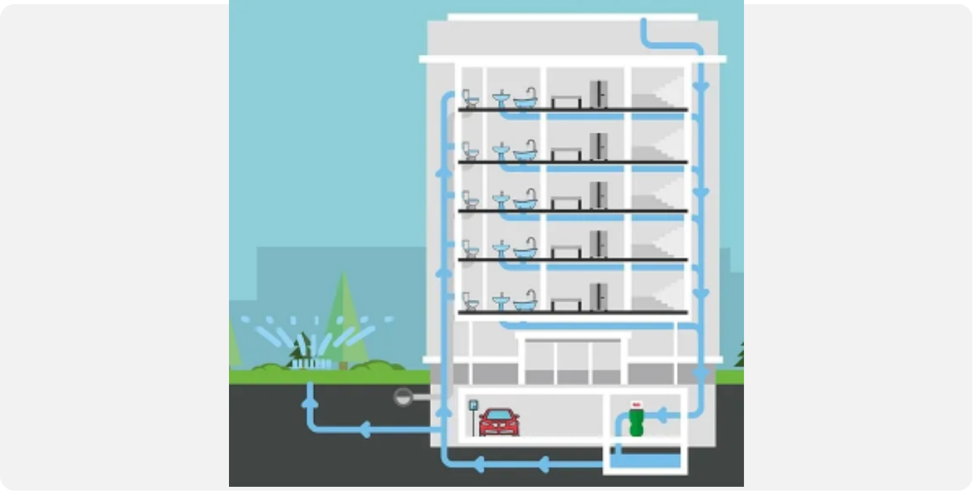Ilustración 3. Esquema de funcionamiento del circuito de reutilización de aguas grises en un edificio. Disponible en Google
